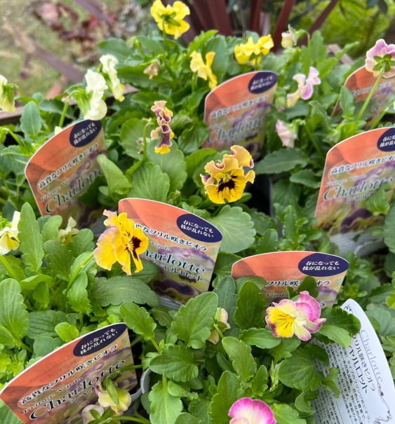 フリル咲きビオラ シャルロットは中輪(3.5cm前後)タイプのフリンジ系ビオラ。