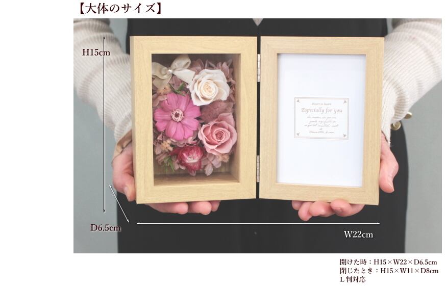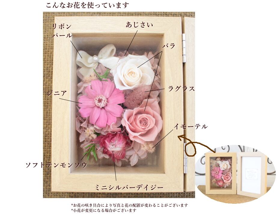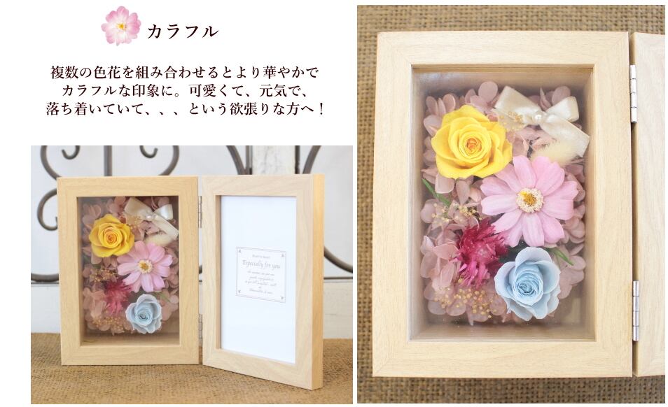 特別な思い出を美しく飾る素敵なフォトフレーム。可憐なお花たちは全てプリザーブドフラワー。本物の美しさはケースに入っていても輝き、写真を添えることで一層華やかになります。