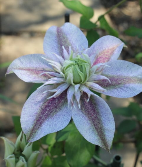 クレマチス 水面の妖精は、フロリダ系のクレマチスで、グレーパープルにグリーンが混じる花色に星斑のような複雑な色の乗り方をするクレマチスです。