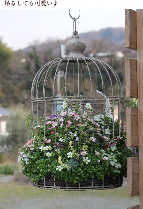 プランターとして直接寄せ植えを作って庭に吊り下げたり観葉植物を入れて室内に飾ったり、このバードケージがあるだけでお洒落な空間になります♪