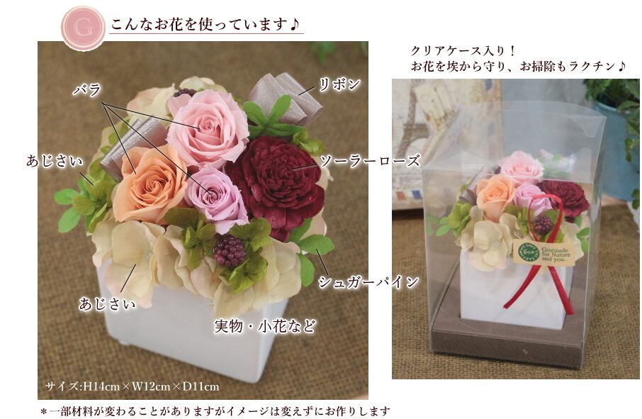 人気のバラをメインに、まわりを囲むお花やリボンでグラデーションを出したふんわりボリュームのプリザーブドアレンジです。クリアケース入りで大切なお花を埃から守り、お手入れも楽ちん♪どこにでも置けるちょうどいいサイズです。初めてプリザーブドフラワーを貰う人にも喜ばれるお花です。